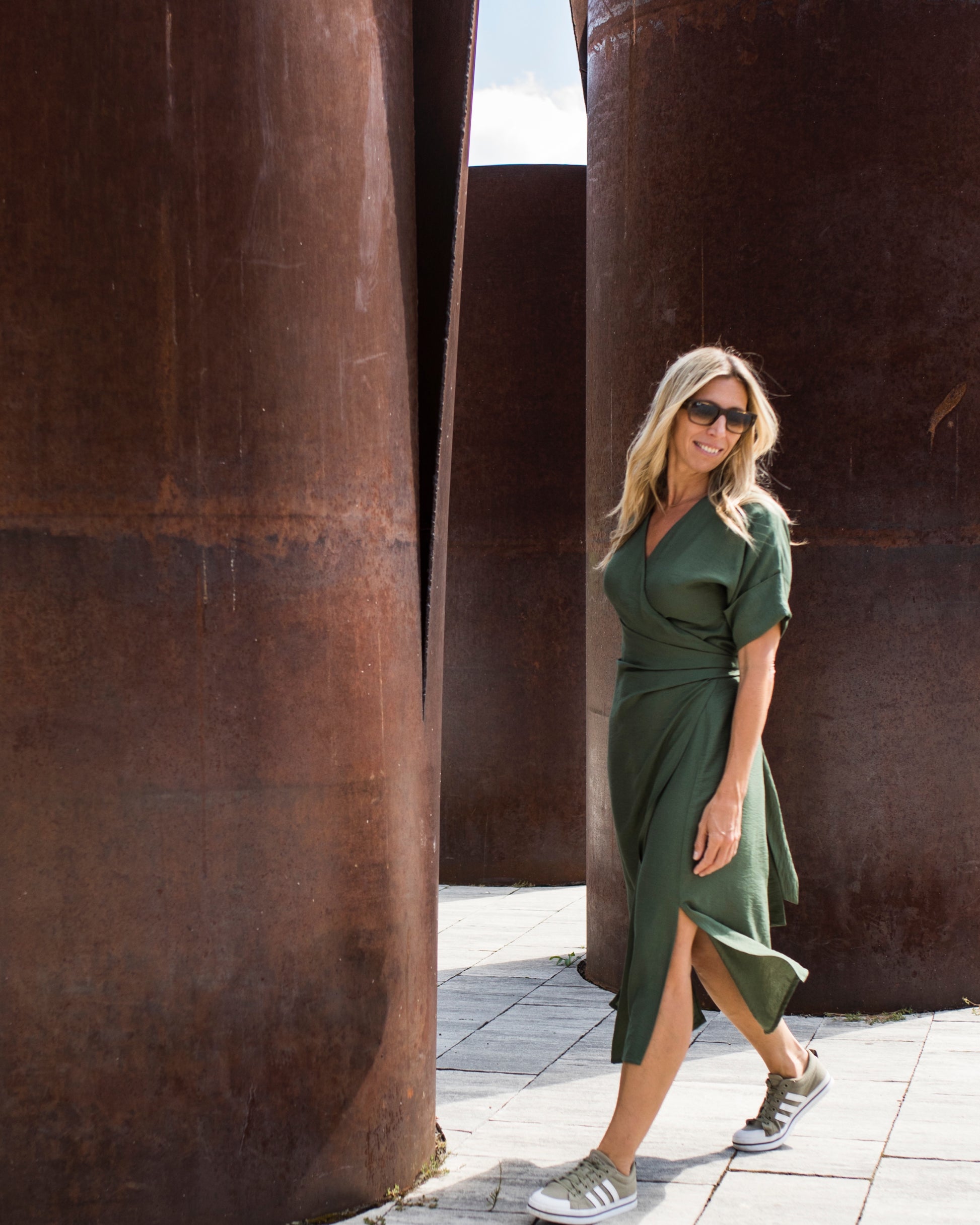 Hajtott ujjú, derékon húzott átlapolós ruha